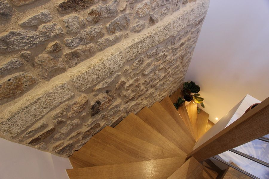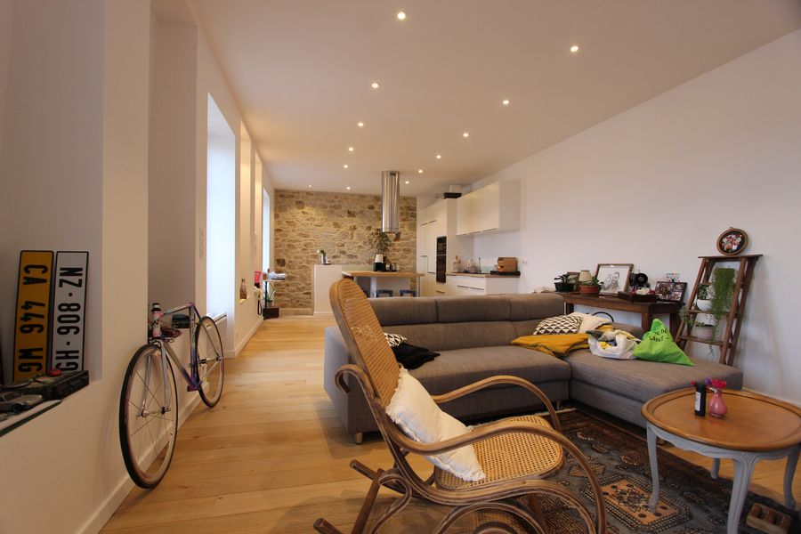 En format duplex, l’appartement se dote au premier niveau d’un hall d’entrée, d’une première chambre de type suite avec sa propre salle de bains. Un bel escalier mène au niveau supérieur et dévoile une vaste pièce de vie, où la hauteur de plafond et la vue dominante s’associent pour une belle sensation d’espace. Parquet massif et pierres apparentes sont du plus bel effet. Une cuisine équipée aménagée complète est ouverte sur l’ensemble.