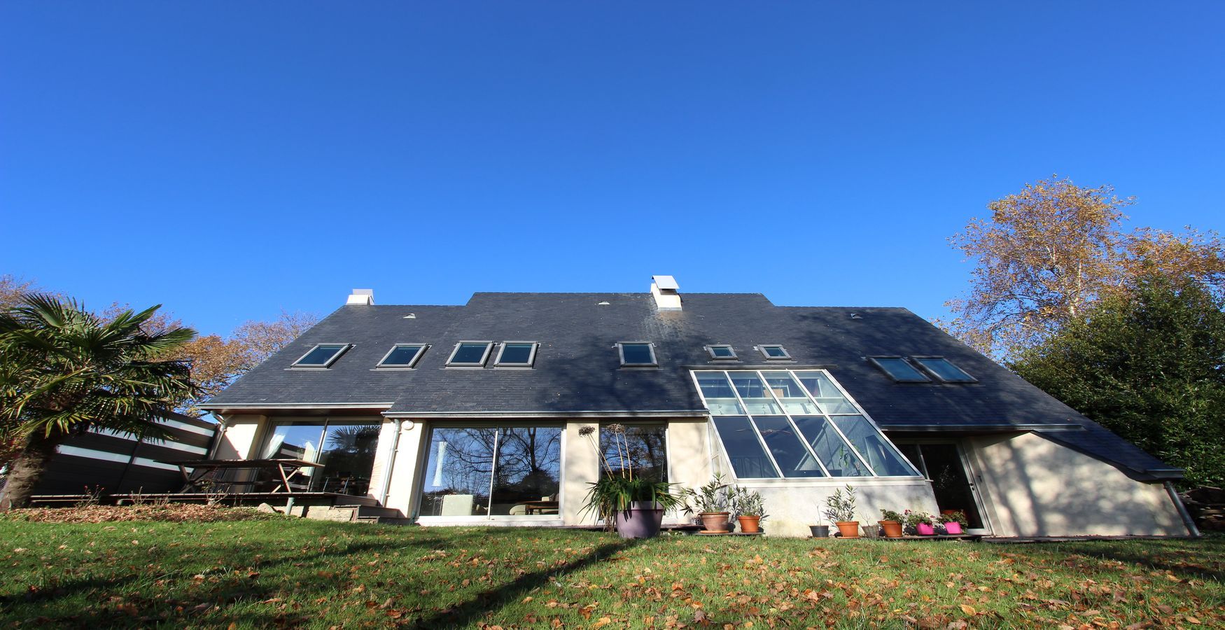 QUIMPER SUD. Sur la route des plages et dans son écrin de verdure, se loge cette avant-gardiste construction d’architecte réalisée en 1982. La rénovation complète faite en 2008 lui redonne toute sa modernité, entre harmonie de matériaux & de prestations. Dès l’entrée, vous accédez à un espace de vie ouvert…
