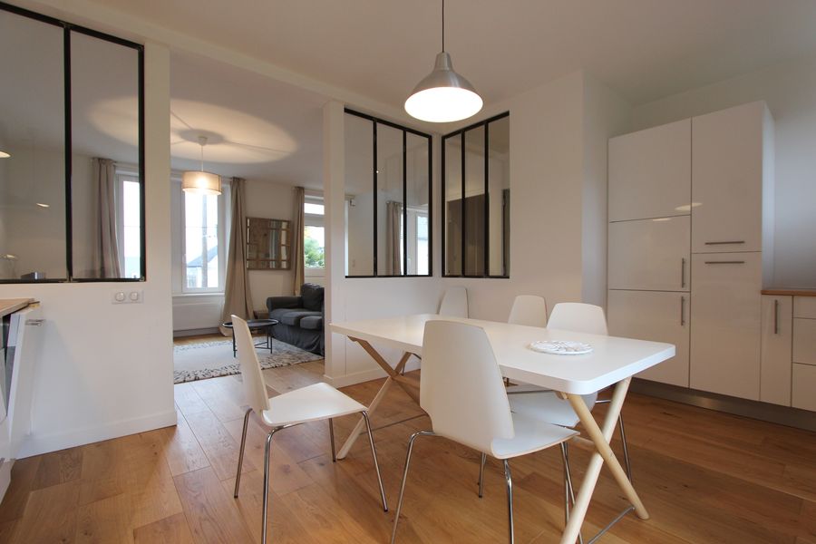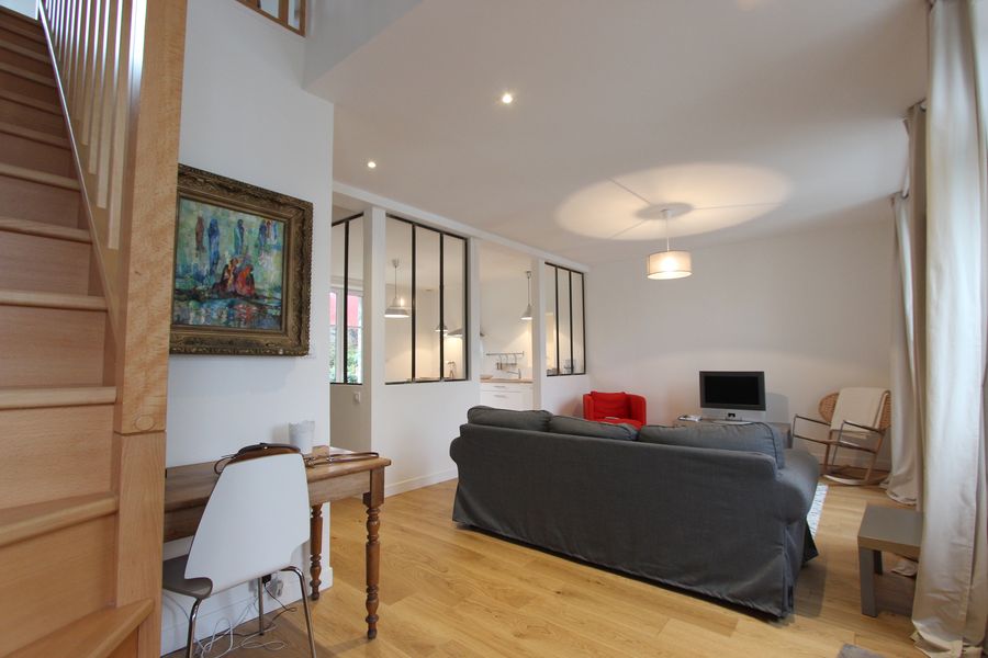 Au calme, avec accès à tous les commerces de proximité en centre-ville, une très jolie année 30 meublée et entièrement rénovée en 2017, avec des matériaux de qualité. Au rez-de-chaussée, un bel espace de vie sur parquet massif, baigné de lumière donnant sur une grande cuisine atelier, elle même ouvrant…