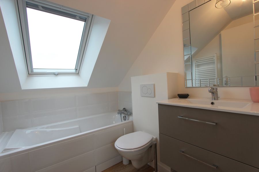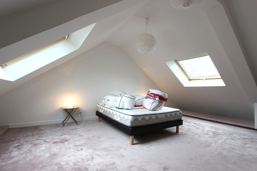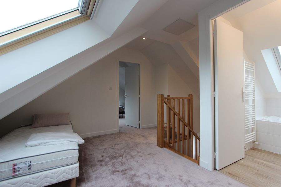 A l’étage, un palier bureau ou espace lecture desservant une grande chambre mansardée et une salle de bains avec wc.