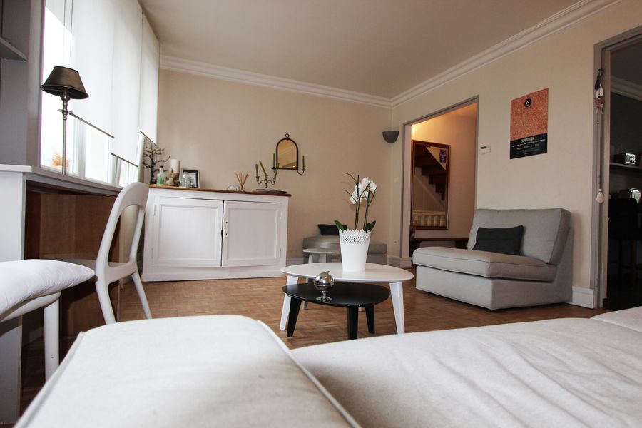 Au premier étage, un bel espace à vivre comprenant une cuisine aménagée & équipée donnant sur une petite terrasse exposée Sud et une salle d’eau avec wc.