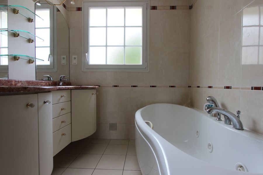 A l’étage : quatre belles chambres sur parquet, une salle de bains avec double vasque et un wc.
