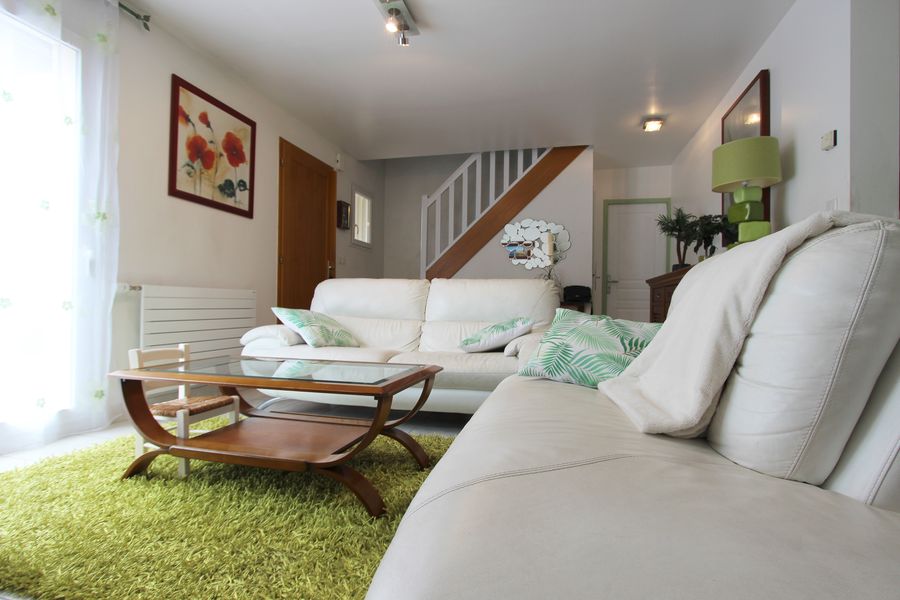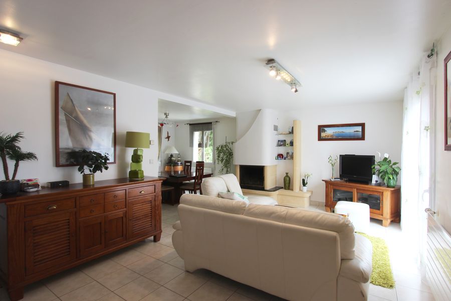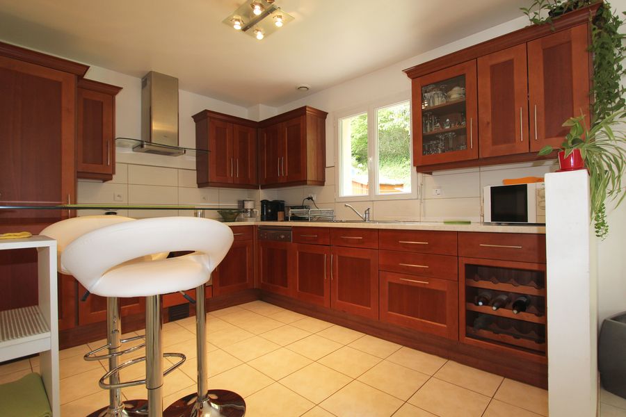 Au rez-de-chaussée, on y trouve une pièce à vivre avec cheminée, une cuisine aménagée & équipée (plaque gaz, hotte, four, réfrigérateur et lave-vaisselle), un wc indépendant et un accès direct au garage & son coin buanderie.