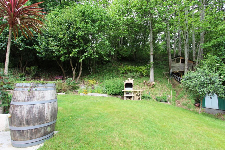 Un jardin arboré avec cabanons et une aire de stationnements pour deux véhicules avec portail motorisé complètent l’ensemble.
