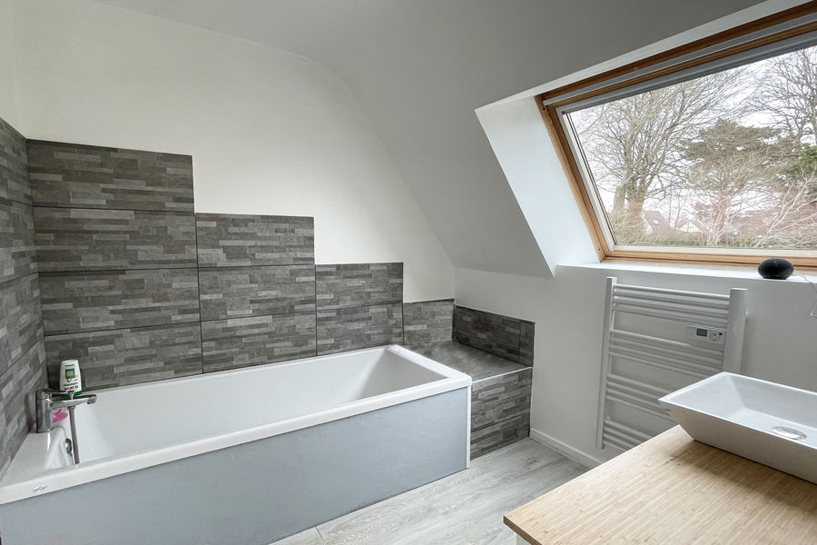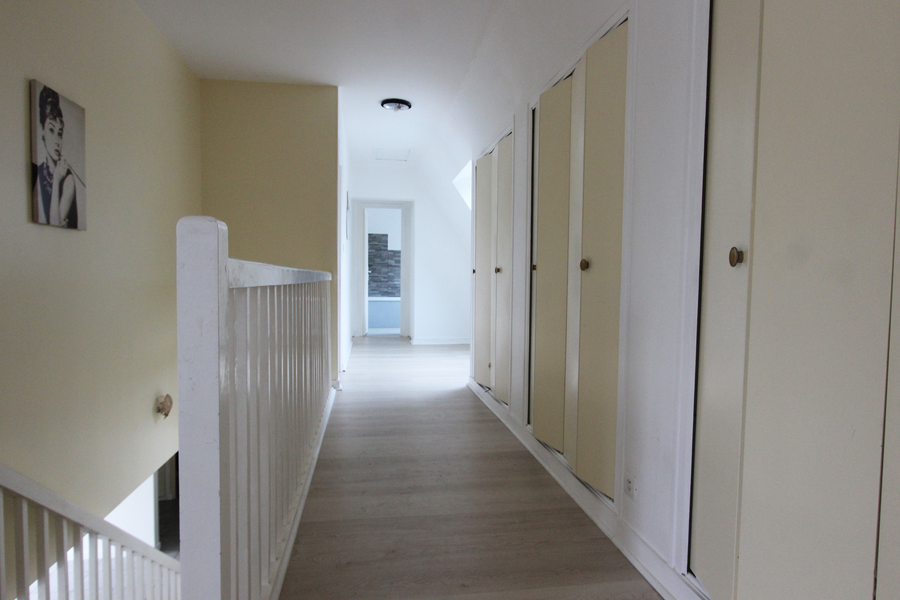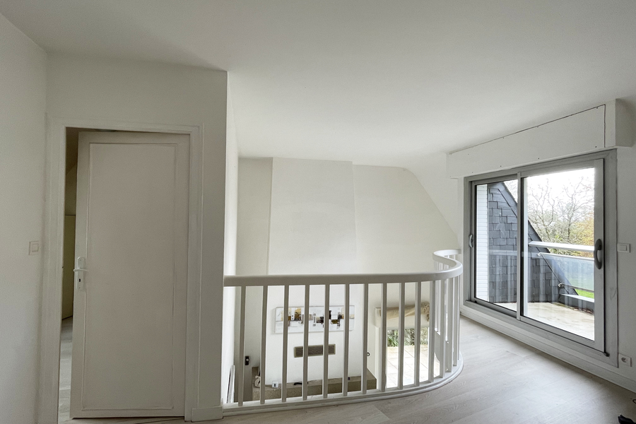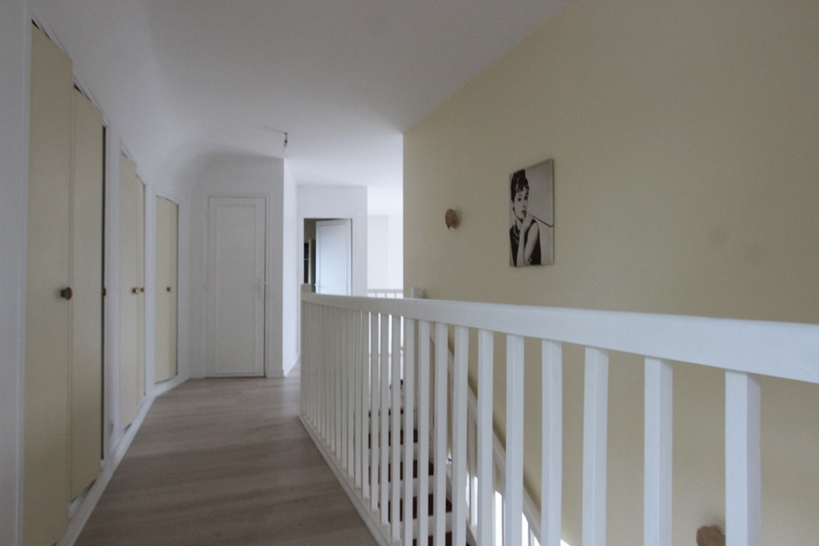 L’étage présente un bel espace nuit avec ses trois chambres sur balcon, une mezzanine dominant le salon, une lingerie et de nombreux rangements, une salle de bains.Les chambres sont lumineuses grâce à leurs baies vitrées et dominent le jardin.
