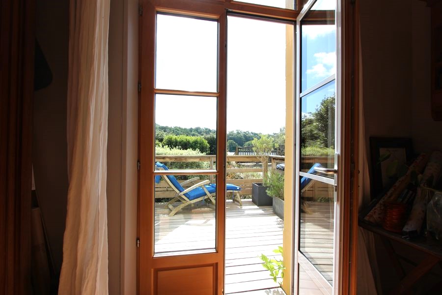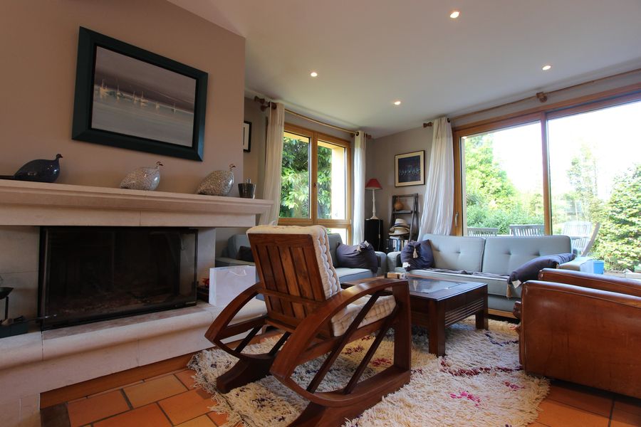 En son rez-de-chaussée, son large espace de vie traversant de 45 m² se compose d’un salon-séjour avec cheminée en insert, qui s’offre un accès sur deux terrasses dont l’une sur un jardin des plus intimes & la seconde sur la rivière.