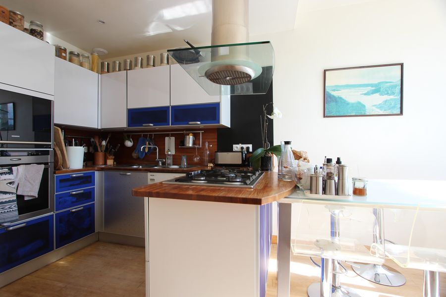 Au même niveau, la cuisine équipée aménagée se loge près de l’espace de vie.