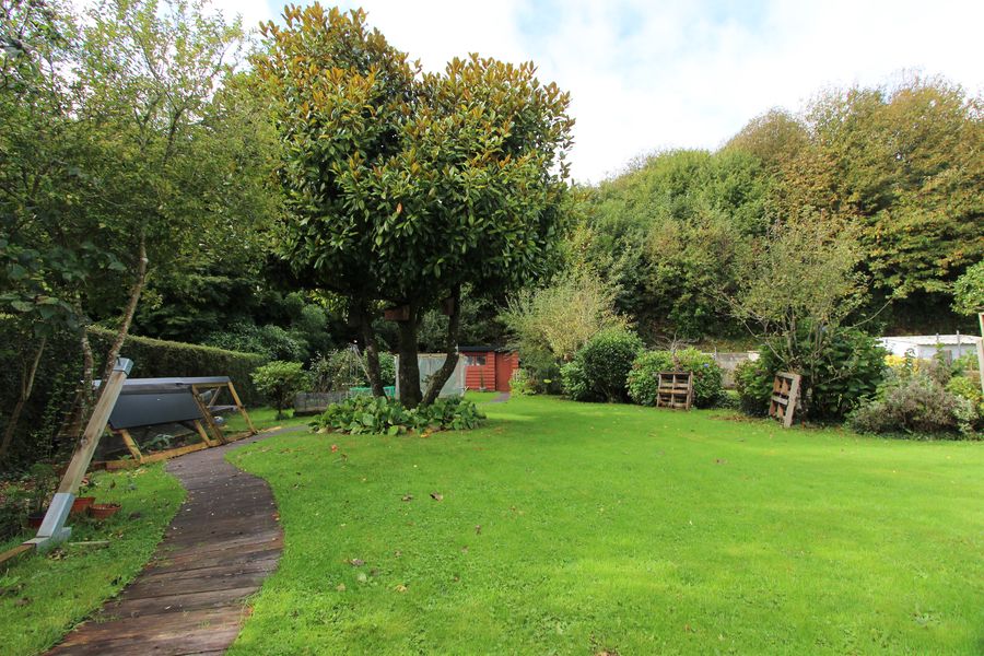 Le jardin se présente plat avec un cabanon viabilisé en électricité et un cabanon de rangement pour les vélos.